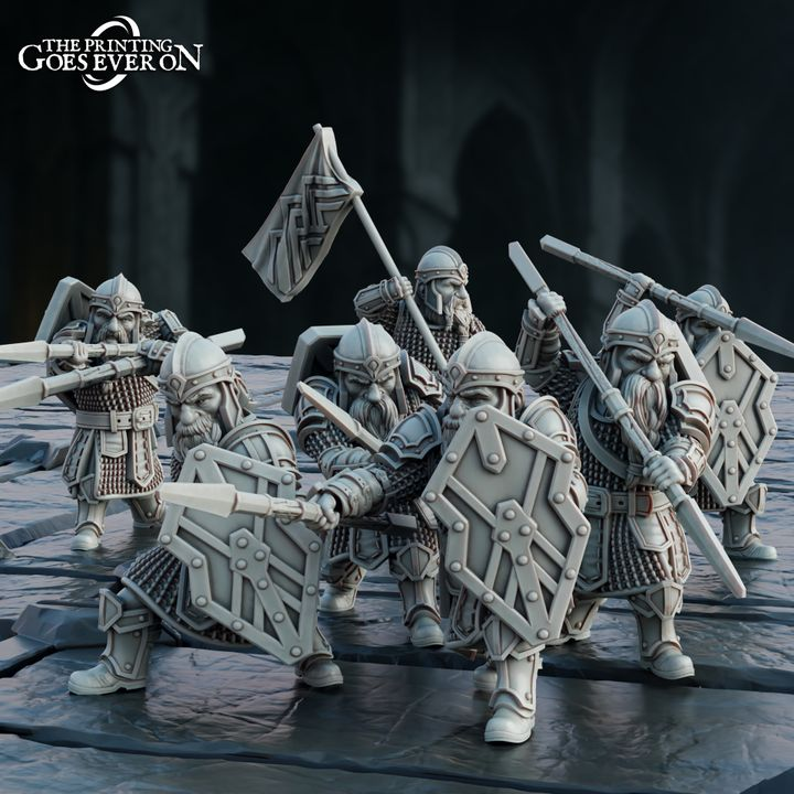 This is a set of 6 Dwarven Steelvein clan spearmen in various positions. The models are in 28mm scale. Delivered not painted. Models by The Printing Goes Ever On